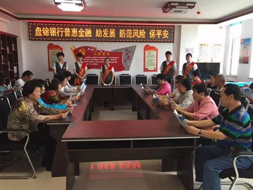 6月14日,盘锦银行盘山支行的党员干部、青年团员一行8人在行长的的带领下开展以“普惠金融助发展 防范风险保平安”为主题的金融知识进社区的宣传活动。活动开始,先由业务骨干为社区居民讲解了“防范电信诈骗”和“非法集资”的主要表现形式、常规的诈骗手段和识别方法等。同时,结合国家的金融政策法规,金融基本知识以及我行新推出的业务品种,深入的给广大居民讲解了以下几个知识:从当前银行利率市场化的放开、储蓄存款保险条例的实施,到我行“服务盘锦、服务中小企业、服务市民”的市场定位,介绍了创业贷款的对象、额度期限、准入条件等,再到我行推出的“随心存”特色存款优越性,电子银行、鹤卡的安全便捷性等。互动环节中,解答了市民提出的投资理财、商业保险与储蓄存款的差别;小面额人民币兑换程序、人民币特征防伪识别技巧、冠字号查询以及安全用卡、自助设备的使用等。