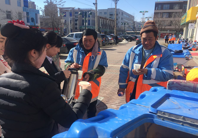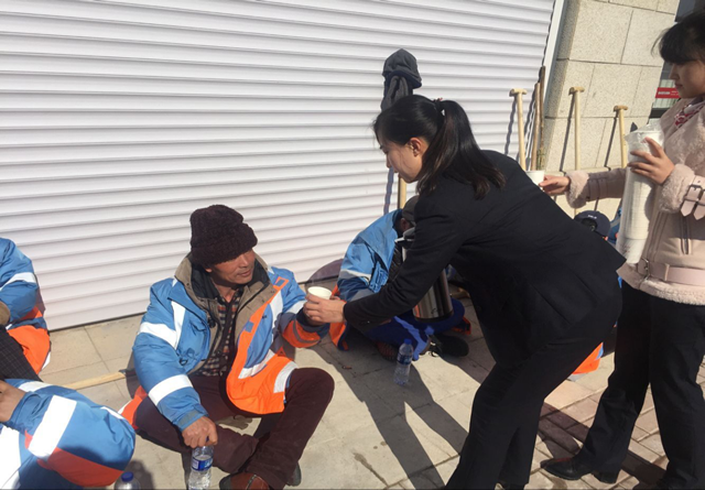 2017年2月24日,大洼支行四名党员及积极分子,为30多名环卫工送去“一杯水”,用最贴心的举动关爱环卫工人。活动中,为环卫工人提供一杯热水,并邀请他们去营业大厅休息。环卫工人队长说:“非常感谢商行对我们环卫工人的照顾和关爱,在寒冷的天气里,能喝上一口热水是最开心的事了。”这些环卫工人用他们勤劳的双手为城市的干净付出了辛勤的汗水,无论是严寒还是酷暑,他们都坚守在自己岗位上。