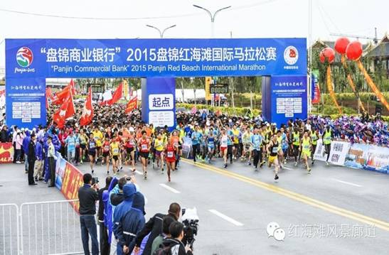 9月12日,由中国田径协会、辽宁省体育局、盘锦市人民政府共同主办的2015盘锦红海滩国际马拉松赛在二界沟渔雁小镇和盘锦红海滩国家风景廊道隆重举行。来自全世界15个国家以及国内26个省、自治区、直辖市和香港特别行政区的近10000名运动员参赛。